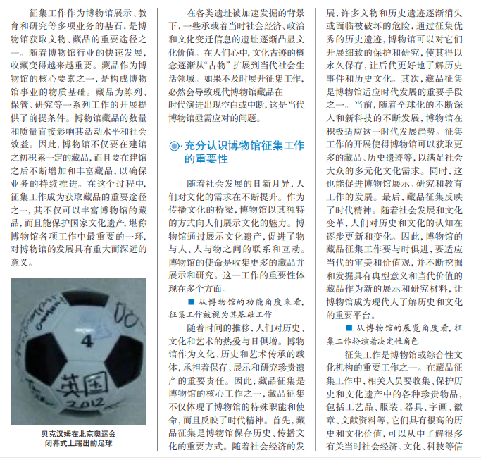 征集工作毫无疑问地占据着博物馆至关重要的地位。随着社会的不断演进,博 物馆的征集范围在逐步扩大。在当今时代,博物馆必须加强征集工作,完善征集方法, 拓展征集途径,为博物馆发展提供充实、丰富的物质资源。本文从博物馆征集工作的 重要性、面临的困境以及应对藏品征集困难采取的措施等几个方面,探讨如何加强现 代博物馆的文物征集工作。