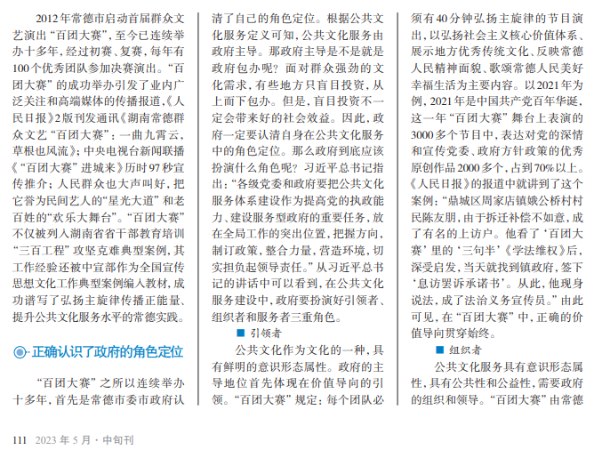 文化是凝聚力量的精 神纽带、推动发展的重要支 撑,直接关系民生福祉、人 的全面发展。当前,我国公 共文化服务体系建设取得 了重要成就,但依然存在 供给质量参差不齐等问题。 常德市群众文艺演出的“百 团大赛”入选全国宣传思想 文化工作的案例选编,为弘 扬主旋律传播正能量、提升 公共文化服务水平提供了 可推广的经验。