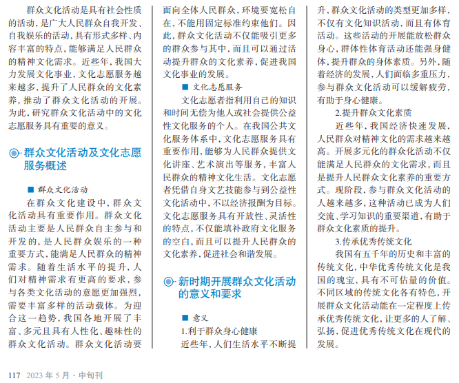 群众文化活动能推 进精神文明建设,促进 社会和谐发展。志愿服 务是加强精神文明建设、 培育和践行社会主义核 心价值观的重要内容。