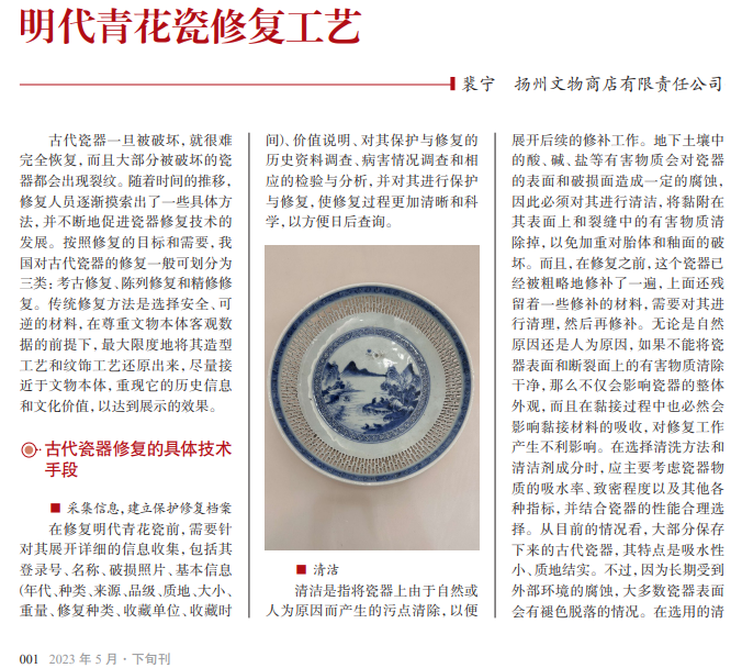 古代瓷器是宝贵的 文物,对其修复和保护是 博物馆和其他有关机构的 工作重点。瓷器承载了悠 久的历史,具有鲜明的时 代特色,但在保存过程中 很容易被破坏。利用现代 科学技术,检测瓷器损伤 部位,并采取相应的修复 工艺措施,选择适合的修 复技术、工具和材料,制 订详细的修复方案,可以 尽可能地恢复其形体、纹 饰和釉色,保证瓷器修复 的最佳效果。
