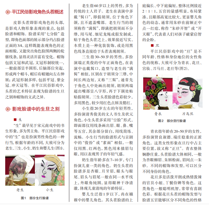 平江民俗影戏是以纸板为原材料,采用平江方言表演,有着独特的“唢呐腔”曲 调的传统民间艺术。头茬的艺术特征表现为脸谱的生旦之别和帽饰的文武之异,体现 了影戏角色不同的生理特征、心理特征和社会特征,反映出当地民众的审美情感和文 化认同。分析影戏角色头茬形制、纹样和色彩等艺术特征,能够为民俗影戏这一非物 质文化遗产的传承、保护和创新提供借鉴和参考。