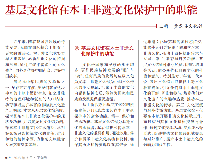 非物质文化遗 产是民族文化的重 要印记,是一个民族 的生活方式和发展 历史的象征。基层 文化馆作为社会文 化平台,应充分发挥 自身的资源优势和 管理优势,注重本土 非物质文化遗产的 挖掘、保护和传承, 打造具有自身特色 的文化品牌,推动本 土文化的再发展、再 繁荣。