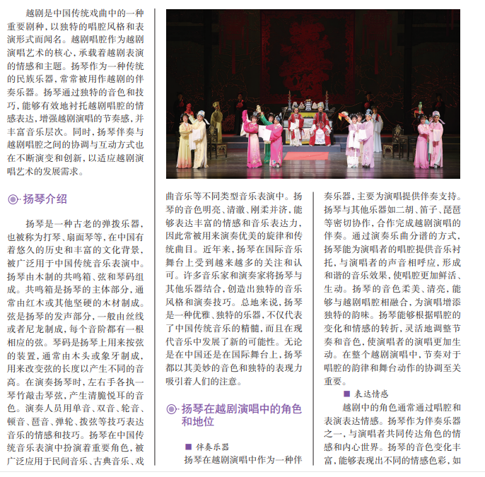 扬琴是越剧表演中重要的乐器之一,它与越剧唱腔之间的协调与互动关系对于 越剧的演唱艺术具有重要意义。通过对越剧演唱艺术的历史演变和扬琴伴奏技巧的 研究,可发现扬琴伴奏在越剧演唱中具有多种功能,如衬托唱腔情感、增强节奏感和 丰富音乐层次等。同时,扬琴伴奏与越剧唱腔之间的协调与互动方式也在不断演变和 创新,以适应越剧演唱艺术的发展需求。