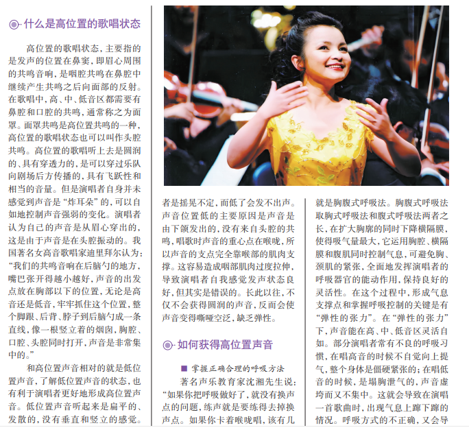 歌唱是将声音与语言相结合抒发情感的艺术,高位置歌唱对于歌唱艺术表演至 关重要。高位置的歌唱特点可以使演唱时的音色达到明亮、统一。