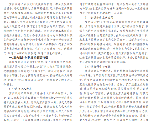 本文对室内设计与时代氛围中创新思维能力的紧密结合进行了具体分析。在创新思维能力上要注重与时 俱进,将艺术创造力和新维度有效地应用于时代发展,对于室内设计具有重要的现实意义。在我国现阶段,这种意识是抽 象的。因此,人们都应保持头脑清醒,在时代的气息中感受“新”,充分发挥创新意识的优势,开创室内设计的新时代。