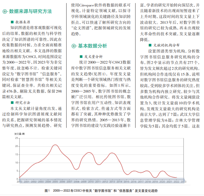 随着包括大数据技术在内的一系列信息技术被应用于图书馆领域,学者对于数 字图书馆信息服务的研究方向与研究内容也出现了巨大的变化。因此,系统地整理和 分析数字图书馆信息服务的研究趋势尤为重要。以客观数据为基础分析,可以更清晰 地展示相关研究的成果、热点区域,并能够据此分析未来的研究趋势并提出相关建议, 为后续的研究提供参考。