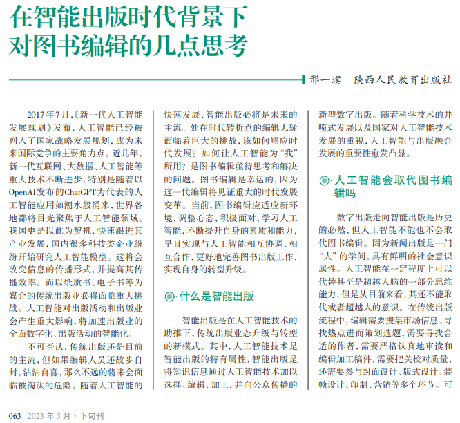 21世纪以来,以人工智能、 大数据、5G等为代表的新技术 在经济增长、文化赋能等多方面 呈现出巨大的发展潜力,出版文 化领域也不可避免地受到了冲 击。从结绳记事、甲骨文,到竹 简、帛书、传统出版的纸质书, 再到数字出版,人们阅读的载体 不断地发展变化。近年来,我国 人工智能技术得到大力发展,并 逐渐被应用到传统出版行业,以 算力、算法、数据为驱动的智能 出版正在重塑出版流程与出版 业务。这对传统图书编辑而言 是一项新挑战。
