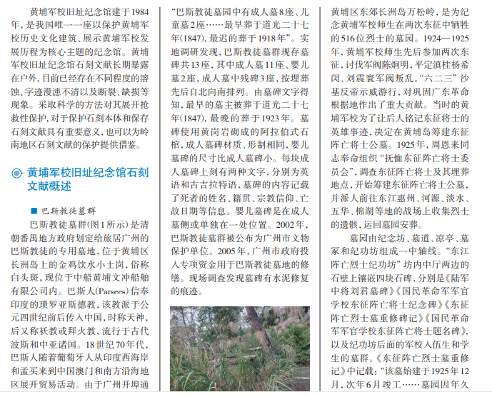 石刻文献是以石为载体,用雕刻的方法记录知识的文献,是学者研究当地历史、 文化交流、乡邦制度的重要原始资料。黄埔军校旧址纪念馆现存石刻文献主要分布 在黄埔军校本部西南面、深井村竹岗山及长洲岛一带,上述三地主要遗存有东征阵亡 烈士墓园、外国人公墓、巴斯教徒墓群,是清代广州对外经贸、文化交流,大革命时期 广东政治、军事的重要见证,也是研究南海海上丝绸之路贸易和广州近现代史的重要 资料。