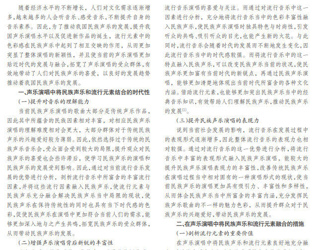 在我国经济发展的不断影响下,我国的文化也有了较大的发展。而随着各国之间的交流不断增多,也有越 来越多的西方文化流传到我国并不断发展,对我国本土的文化造成了一定的冲击,但也给我国本土文化的发展带来了 一定的发展机遇。然而相对于传统民族声乐来说,要不断推动我国民族声乐的发展使更多的人能够充分地了解当前的 民族声乐,把民族声乐与流行元素进行融合也是一种推进和发展,能够提升我国民族声乐的新颖性、科学性、时代性与 文化性,使民族声乐在发展过程中,能够让更多人获得更多的感受,从而推进民族声乐的色彩感与传统性。