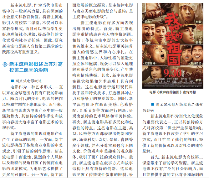 传统的主流电影以“新主流”的形式吸引了越来越多的观众,尤其是大学生。新 主流电影以其商业化的运作模式和生动的艺术表达,成为大学生娱乐消费的重要选 择。此外,新主流电影还承载着主流的思想理念和鲜明的思想政治教育功能,弘扬和 诠释了中国精神和中国力量,对于提升大学生的综合素质和塑造他们的健康人格具有 积极意义。