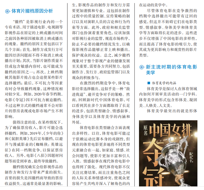 近年来,在我国春节档电影中,体育类题材的电影频频撤档,分析其中原因,有体 育电影商业化薄弱、体育美学尚未融入春节文化氛围中等多方面原因。