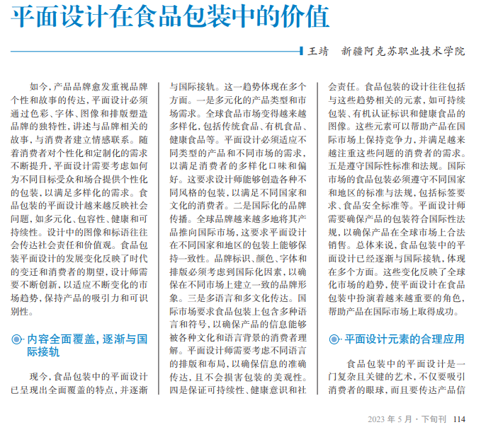 随着科技的进步和经济的发展,食品包 装中的平面设计正经历着显著的变化。这些 变化反映了消费者需求、技术进步和市场趋 势的演变。随着人们对美食需求的不断提升, 食品包装需要适应各种类型的食品。从传统 的食品如谷物、面包,到新兴的食品如有机、 健康食品,平面设计必须灵活应对不同类别 的产品。而今,消费者对环保包装的需求不 断提升,使得更多的可降解、可回收和环保 材料被广泛使用。平面设计需要考虑如何在 包装上传达可持续性信息。食品包装需要为 消费者提供更多的信息,包括食品成分、营 养信息、食用建议、过敏信息等。平面设计 要确保这些信息以清晰、易读的方式呈现, 帮助消费者作出明智的购买决策。