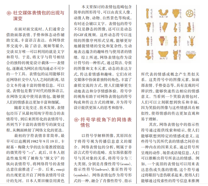 随着社交媒体的发展,人与人之间的沟通方式发生了巨大的变化。表情包成为 网络世界交流的重要工具。本文借助设计符号学的理论,描述、剖析并总结了表情包 设计中情感与趣味的表达方式,并且探究其如何增强信息传达的力量。