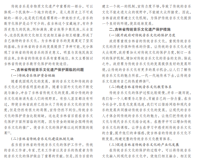 每个地方的传统音乐都有各自的特点,吉林省也不例外,吉林省传统音乐具有自己的独特的传统文化特 征,是我国传统音乐的重要组成部分,吉林省有很多民族,是我国少数民族的聚集地,特别能体现民族音乐的特色,除此 之外,吉林省的音乐的发展可以体现当地的风貌,有非常重要的历史价值。但是,对于吉林省传统音乐文化,我们也要对 其筛选,传承优秀文化,剔除落后文化,我们要积极创新,使其以新的形式和姿态出现在人们的面前,而不是全部接受。