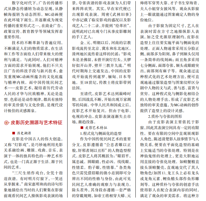 数字技术的发展使得广告设计的形式不断更新迭代,由此诞生了新的视觉传播 形式——MG动画。MG动画最早由国外传入,因此其设计风格偏向西方文化,缺少 中国特色,无法满足我国受众的精神文化需求,亟需探究可供MG动画应用与借鉴的 视觉元素与艺术特征,为发展中国特色的MG动画设计提供新思路。