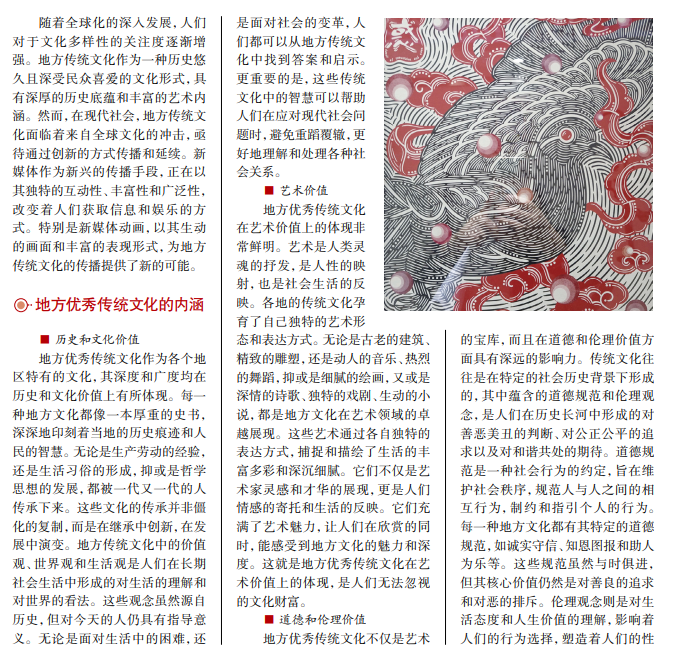 随着信息科技的飞速发展,新媒体已经全面渗透到人们的生活中,并在各领域都 扮演着重要角色。动画作为一种艺术表现形式,因独特的表现力和传播效果,广受各 年龄层群体的喜爱。地方传统文化是每个地区、每个民族历史积淀和文化特征的体现, 是民族和地区精神的寄托。在全球化浪潮下,如何传承和发扬这些具有深厚历史底蕴 和独特价值的地方传统文化,对于弘扬民族精神、保持文化多样性具有重要意义。新 媒体动画以其生动、形象的表现方式,为地方传统文化的传播提供了新的路径和方式。