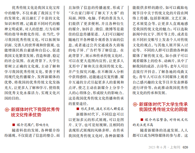 在社会不断发展进步的 过程中,越来越多的人感受到 我国优秀传统文化的魅力,也 意识到传承和发扬优秀传统文 化的重要性。新时期的大学生 更要积极承担社会责任,发挥 主观能动性,主动学习和理解 优秀传统文化,不断丰盈内在, 并善于利用新媒体媒介平台, 让我国优秀传统文化被更多人 理解、认同。