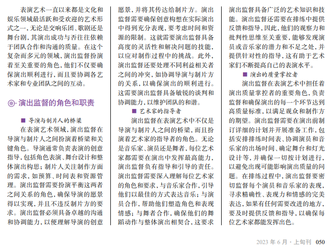 随着人们物质生活 水平的逐渐提高,越来越 多的人开始追求精神层 面的文化享受,对艺术表 演的需求也在不断提高, 这给艺术表演提出了更 高的要求。演出监督在 交响乐团、舞台剧等演出 中发挥着关键作用,要提 高演出效果,必须优化演 出监督在团队合作和沟 通中的作用。