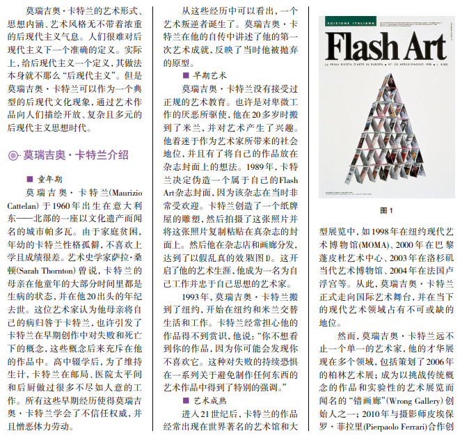 莫瑞吉奥·卡特兰被看作马塞尔·杜尚的继承者,他通常以动物的标本、骨骼、 机械装置、雕塑和模型,甚至活体动物作为媒介创作非同寻常的艺术品,挑战现有的 艺术与社会规范,引导人们重新审视内心根深蒂固的准则。莫瑞吉奥·卡特兰因此也 成为当代艺术界备受关注且富有争议的艺术家之一。