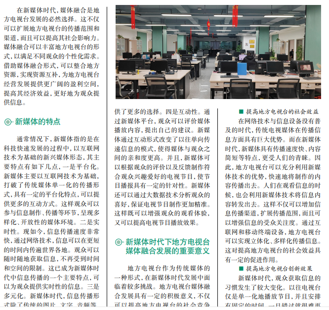 在新媒体时代,地方电视台可以通过构建媒体平台,整合电视、网络、手机等多种 媒介,实现媒体融合发展。为了满足观众的多样化需求,地方电视台可以提供多样化 的内容服务;可以借助新媒体技术,扩大媒体影响范围,提升传播能力和竞争力。