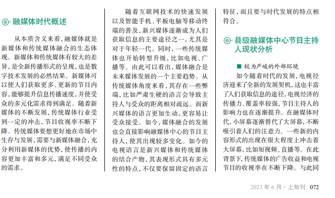 随着各级媒体平台的发展,县级融媒体中心节目主持人需转变传统思维,以新媒 体发展方向为基础,以人们的信息接收习惯为依据,以自身专业优势为驱动,精准把 控新媒体趋势变化,不断增强自身的竞争优势,实现自我转型与提升。