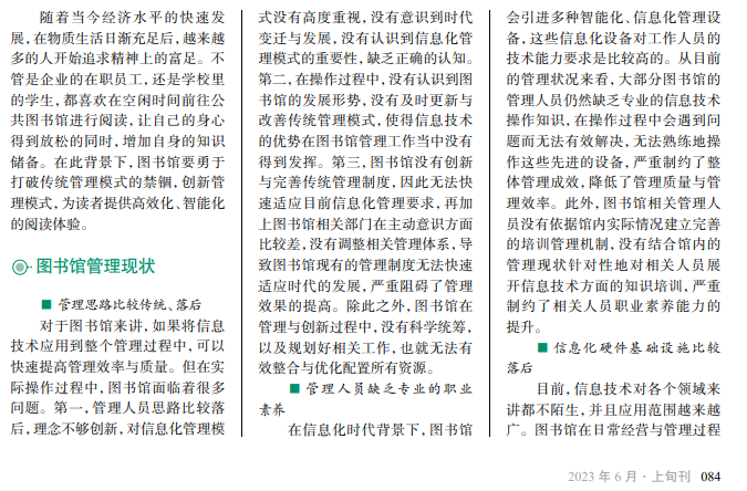 在科学技术的推动下,信息技术被广泛应用于各行各业,包括图书馆管理工作。 随着阅读需求和阅读形式的多样化发展,传统的图书馆管理模式显然无法适应当前信 息时代的要求。基于此,图书馆应及时更新管理理念,创新管理模式,建立健全管理 机制,应用互联网技术,助力广大阅读爱好者实现高效阅读。