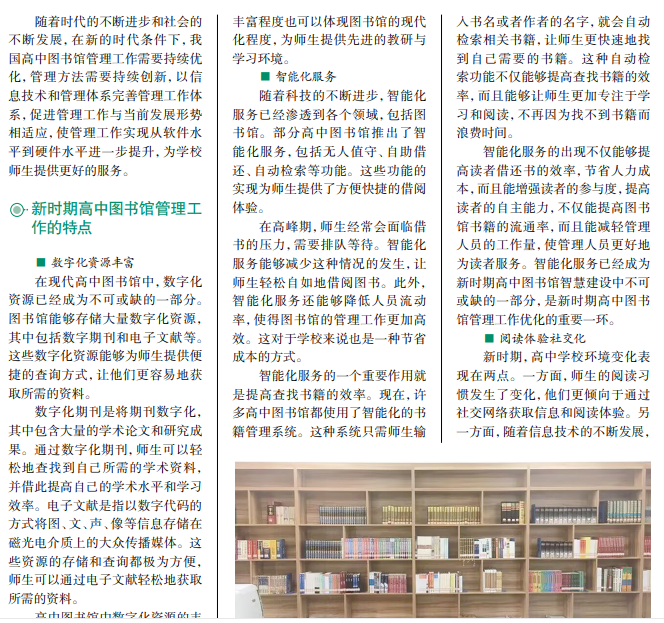 高中图书馆是学生获取知识的重要场所之一,通过精心管理和维护图书资源以及提 供咨询服务,可以使学生更好地利用馆内资源,提高学习效果。因此,优化图书管理工作 非常重要,需要制订具体策略,以便更好地为学生服务。