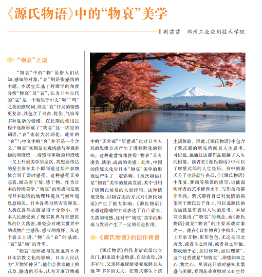 紫式部创作的《源氏物语》,格调细腻、悠缓,无论是在文学领域还是在美学领域,均是日本文学及艺 术养分的来源。书中男女主人公的主要生活就是恋爱,他们为情而生,为情而死,人生充满浪漫主义。但 恋爱本身并不完美,他们的生命即使绚烂多姿,但最终归于虚无,过程“哀而美”。在此基础上,日本国学 家本居宣长提出了“物哀”的概念。