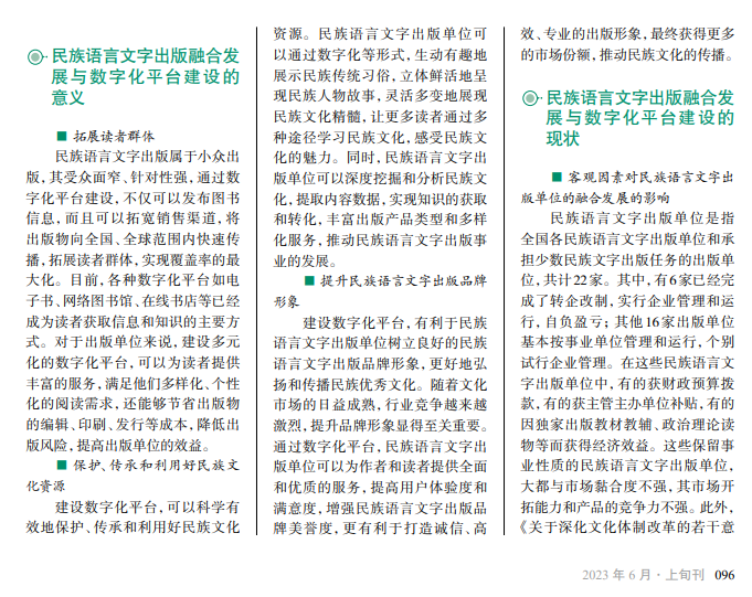 随着大数据、云计 算、人工智能等技术的 发展和互联网的迅速普 及,全球进入数智化产 业时代,这给传统出版 业带来巨大的挑战。民 族语言文字出版应顺应 时代要求,加强融合发 展,建设数字化平台, 提高出版生产力,增强 市场竞争优势,以实现 可持续发展。