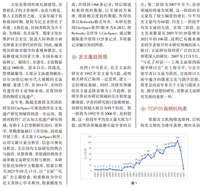 文庙是中国传统礼制建筑,在古人的生活中常作为祭祀孔子与教化学生的场所, 是儒家文化的物质载体,也是中国文化遗产的重要组成部分。文章借助可视化软件 CiteSpace,关注文庙研究领域热点,全面而系统地认知文庙现有研究,发掘文庙深层 内涵与其价值。
