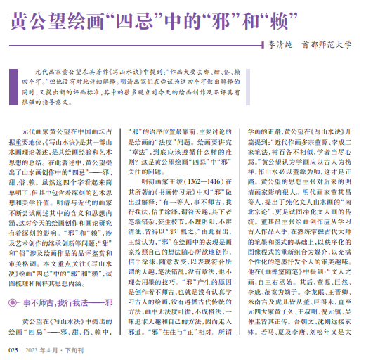 元代画家黄公望在其著作《写山水诀》中提到:“作画大要去邪、甜、俗、赖 四个字。”但他没有对此详细解释。明清画家们在尝试为这四个字做出解释的 同时,又提出新的评画标准,其中的很多观点对今天的绘画创作及品评具有 很强的指导意义。