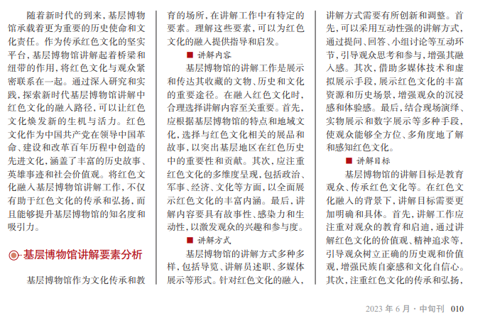 随着社会的进步和文化 的多样化,基层博物馆作为文 化传承和教育的重要载体,扮 演着重要的角色。基层博物 馆作为服务地方社区的文化 机构,承载着当地历史文化、 民俗风情和社会记忆,是人们 了解本土文化的窗口,也是培 养公民文化素养的重要场所。