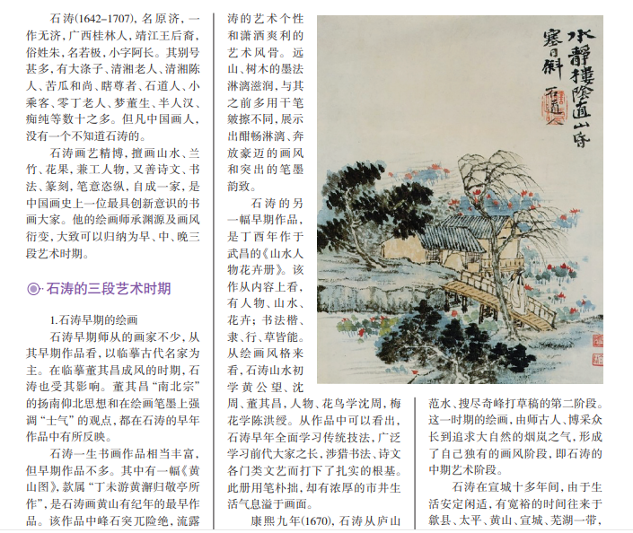 中国山水画历史悠久,具有深厚的文化底蕴,不仅在中国画史中占有重要位置, 且代代相传,继往开来。石涛是中国山水画史上的一位奇人,他直师造化,打破藩篱, 无古无今。石涛“我用我法”的大胆创新,给当时以仿古为能事的画坛吹去了劲风,让 人耳目一新。他既是绘画探索者和革新者,又是绘画艺术的理论家。