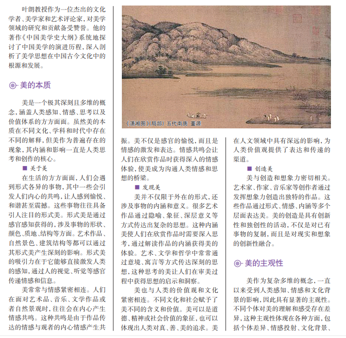 美作为一个广泛而深刻的概念,一直以来吸引着人类的思考和追求。美学作为 对美的研究,涉及审美体验、情感共鸣、艺术创造、文化传承等诸多层面。与此同时, 中国的美学历史也是世界上最为悠久和丰富的,蕴含了中国深厚的文化传统和哲学思 想。在这个背景下,叶朗的《中国美学史大纲》一书为人们提供了一扇窥探中国美学 与中国文化、中国哲学思想交互融汇的窗口。