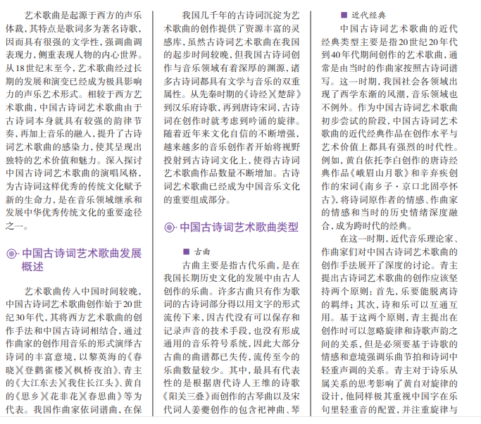 中国古诗词艺术歌曲是我国民族音乐文化的重要组成部分,具有鲜明的民族性, 且具有可塑性强、典雅、大方等许多优点,是优秀传统文化和近现代艺术歌曲创作手 法的结合,更是音乐与文学两种艺术形式的碰撞。在倡导弘扬与传承传统文化的当下, 中国古诗词艺术歌曲受到了越来越广泛的关注。