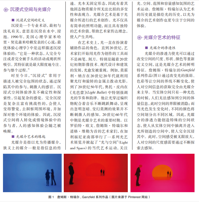 “沉浸式”一词是时下数字文化产业的热门词汇之一,通过融合新媒体艺术、装置艺术、数字影像等技术 打造沉浸式空间,将用户的体验感做到极致。其中,光媒介艺术是塑造沉浸式空间的重要手段,然而目前光媒 介的运用手法简单、同质化严重,仅仅在视觉层面上的呈现并不能得到心灵的沉浸。现代艺术家应探究光媒 介艺术与沉浸式空间的关系,总结光媒介在沉浸式空间中的营造手段,为未来的沉浸式空间创作提供思路。