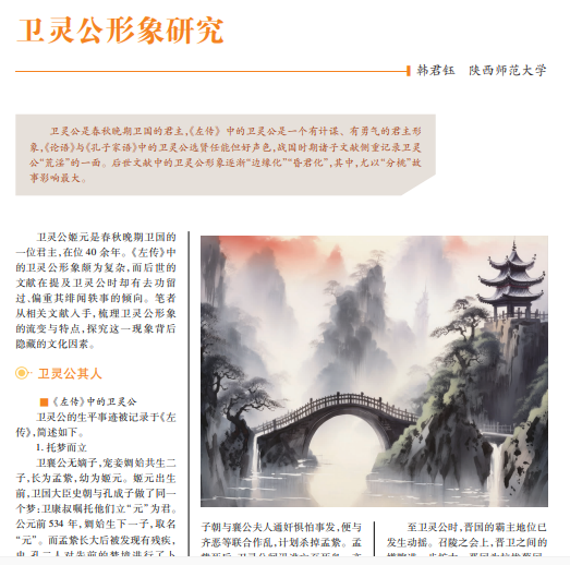 卫灵公是春秋晚期卫国的君主,《左传》中的卫灵公是一个有计谋、有勇气的君主形 象,《论语》与《孔子家语》中的卫灵公选贤任能但好声色,战国时期诸子文献侧重记录卫灵 公“荒淫”的一面。后世文献中的卫灵公形象逐渐“边缘化”“昏君化”,其中,尤以“分桃”故 事影响最大。