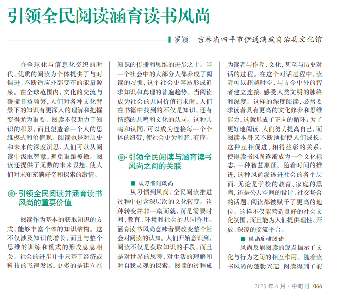 在科技的强大推动下, 全球正步入数字化时代,人类 的阅读习惯也随之发生了深 刻的变革。当下,社会需提 高全民文化修养,培育公民 全面而均衡的个性。只有深 化人们对阅读的认识,增强 全民阅读意识,才能真正营 造全民阅读的良好环境,使 阅读成为个体追求知识、实 现自我价值的手段。阅读不 仅能为个体带来丰饶的智慧, 而且能加深人与人之间的理 解,提升社会的文明程度。