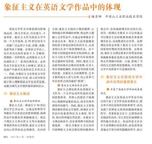 象征主义是 20世 纪 欧 洲 文 学的一种流派, 它通过使用各种 符号和象征手法 来表达思想和情 感。英语文学作 品中也有着丰富 的 象 征 主 义 表 现,包括色彩、物 品和场景等方面 的象征手法。