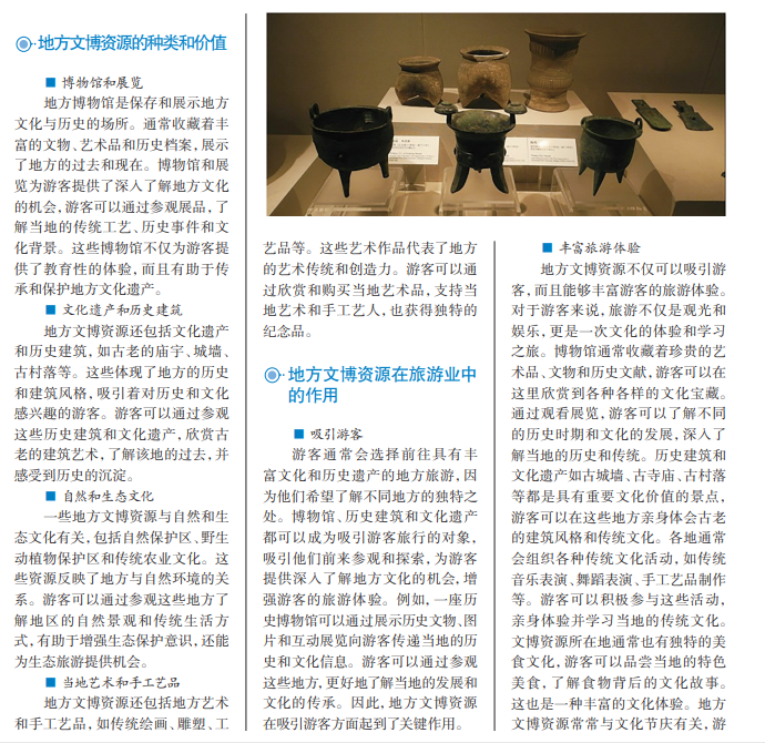 地方文博资源是一个地区独特的文化遗产和历史积淀的体现,代表了该地区的 历史、文化和传统,这些资源包括博物馆、文化遗产、历史建筑、文物等,它们不仅具 有较高的文化价值,而且对于旅游业的发展具有不可估量的价值。深入挖掘地方文博 资源的潜力,可以丰富游客的旅游体验,促进文化交流,并可以为地方经济带来新的 增长点。