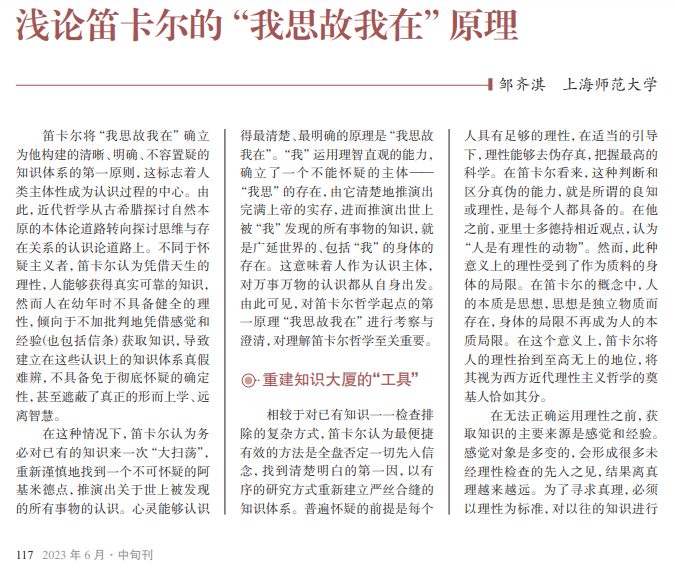 以真理追求者标榜的笛 卡尔为建立无可争议的知识体 系,以有序的研究方式、普遍怀 疑的方法寻找到清楚、明晰的 第一原理“我思故我在”。这一 原理的确定标志着人类主体性 成为认识过程的中心。由此, 近代哲学从古希腊探讨自然本 原的本体论道路转向探讨思维 与存在关系的认识论道路上。