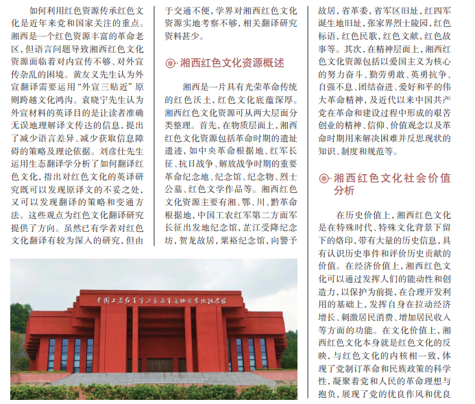 湘西红色文化是中国文化的重要组成部分,蕴含着丰富的文化底蕴和厚重的历 史内涵,是革命先辈留下的弥足珍贵的文化遗产。因此,推动湘西红色文化的译介与 传播具有重要历史意义和现实意义。本文从湘西红色文化资源概述入手,分析了湘西 红色文化的文化价值,然后运用生态翻译学探讨了湘西红色文化的英译方法,并提出 了湘西红色文化的传播策略。