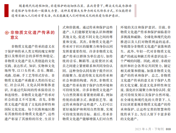 随着现代化进程加快,非遗保护的迫切性凸显。在此背景下,群众文化成为推动 非遗保护与传承的一股强大力量。这种具有强大生命力的文化传承方式,不仅能将非 遗项目融入人们的日常生活,而且能激发人们对传统文化的热爱与保护意识。