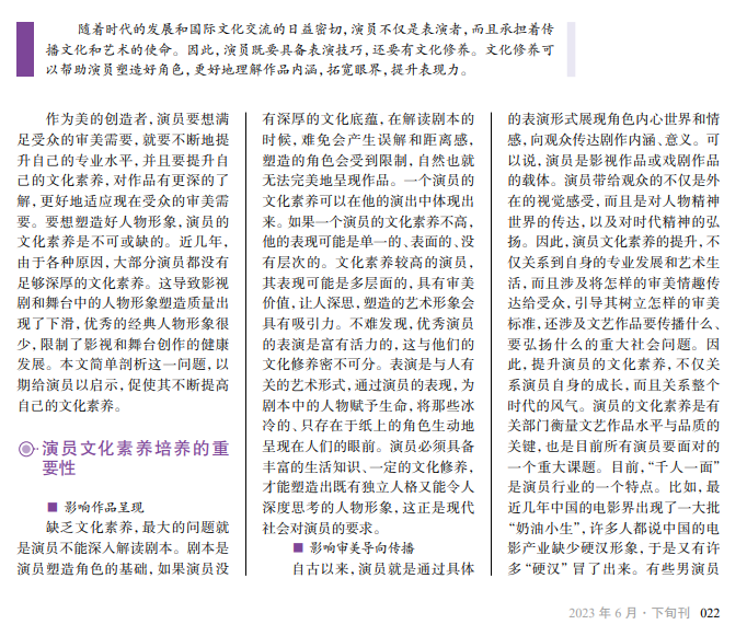 随着时代的发展和国际文化交流的日益密切,演员不仅是表演者,而且承担着传 播文化和艺术的使命。因此,演员既要具备表演技巧,还要有文化修养。文化修养可 以帮助演员塑造好角色,更好地理解作品内涵,拓宽眼界,提升表现力。