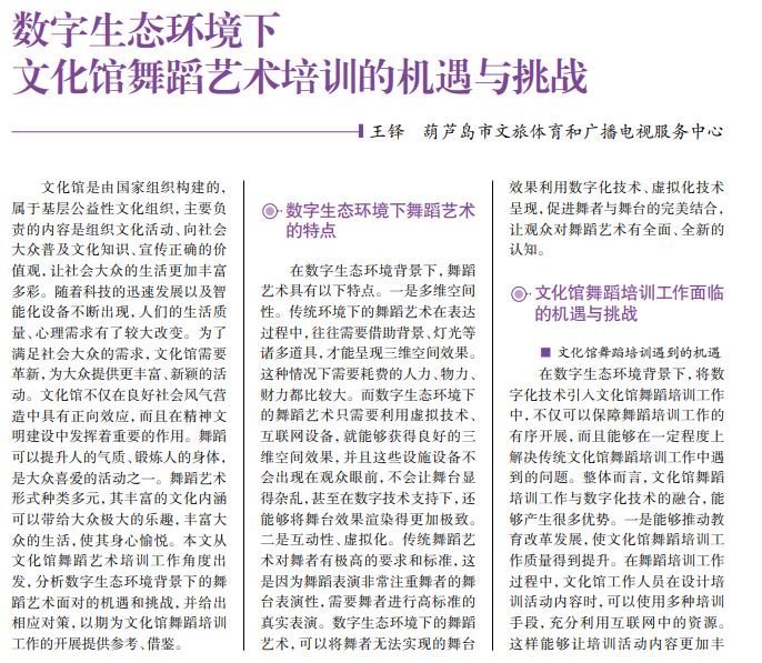 在科技水平飞速 发展的当下,舞蹈艺 术在新媒体、互联网 的助力下获得了较大 的进步。数字生态环 境下,舞蹈艺术的作 用得到了全面发挥, 受众面也得到扩大。 如何利用互联网的优 势发挥舞蹈艺术的作 用,提升舞蹈艺术的 教学质量,是舞蹈艺 术教育工作者需思考 的问题。