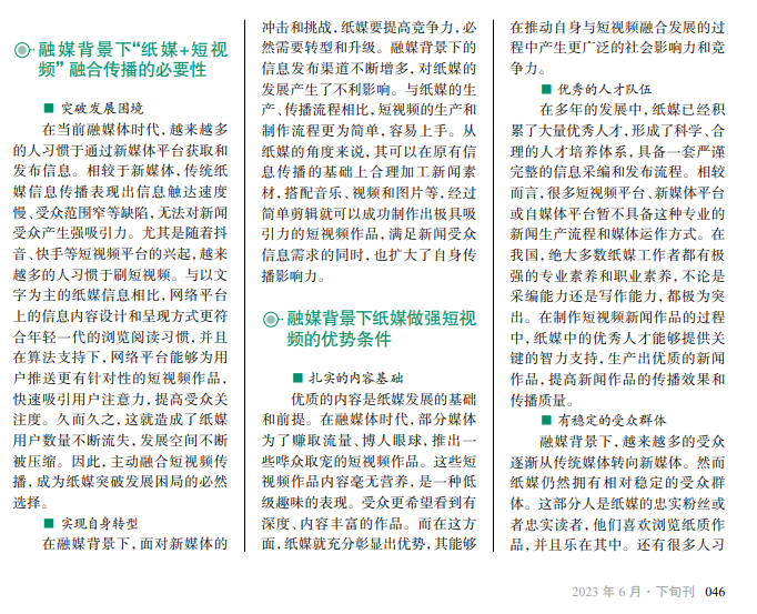 近年来,随着各类短视 频平台的出现及快速发展, 越来越多的传统媒体正在加 速转型,在短视频赛道上竞 争,努力提高自身竞争力和 影响力。与此同时,人们对 信息需求呈现碎片化特点, 使得短视频风靡,成为很多 人日常生活中不可或缺的一 部分。因此,对于传统纸媒 来说,做好纸媒传播与短视 频传播融合,是提高自身市 场竞争力的重要路径。