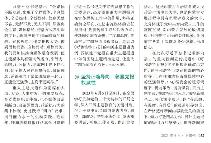 做好重大主 题报道是党的各 级新闻媒体的职 责 使 命,地 市 党 报要坚守职责使 命,提 高 政 治 站 位,做 实 报 道 内 容,创 新 报 道 形 式,提 升 报 道 效 能,提 高 新 闻 舆 论 的 传 播 力、引 导力、影响力、公 信 力,巩 固 壮 大 主流思想舆论。
