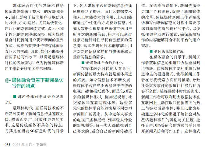 随着融媒体时代的 快速发展,媒体融合成为 传统媒体转型的重要目 标。除了坚守传统的新闻 传播渠道外,传统媒体也 开始通过公众号、社交媒 体、短视频平台等多类渠 道发布新闻信息。传统媒 体转型,不仅要开辟新的 传播途径,而且要转变新 闻工作者传统的新闻采 访和写作思路,以创新的 方式丰富新闻内容、突出 新闻热点,不断提升媒体 融合背景下新闻采访和 写作的能力水平。