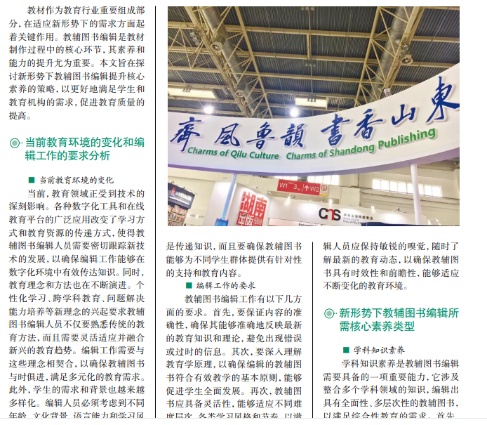 随着教育的不断发展,教辅图书编辑的核心素养提升变得尤为重要。应对市场 化改革和满足人们日益增长的多元化文化需求,是图书编辑的使命和责任。教辅图书 编辑要主动拓宽知识面,提高编辑技能和核心素养,应对不断变化的教育需求,提高 教辅图书的质量和实用性。
