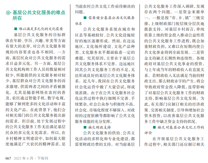 文化是一个国家 的灵魂,国家繁荣离不 开文化繁荣的加持,所 以文化繁荣是国家强大 的根基。随着农村物质 生活水平的不断提高, 农民对精神文化的需求 也日益提高。要想提高 基层公共文化服务质 量,就要听取群众的呼 声,组织各种形式的文 化活动,让全民一起分 享社会主义文化发展和 繁荣的成果。